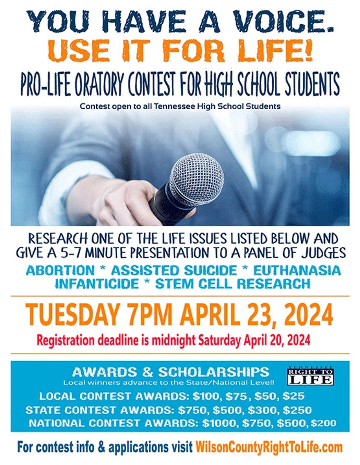 Download and print the REGISTRATION FORM for the Wilson County Oratory Contest for High School Students to be held on Tuesday evening April 23, 2024 @ 7PM in Lebanon, TN. NOTE: The registration deadline is midnight on Saturday April 20, 2024.