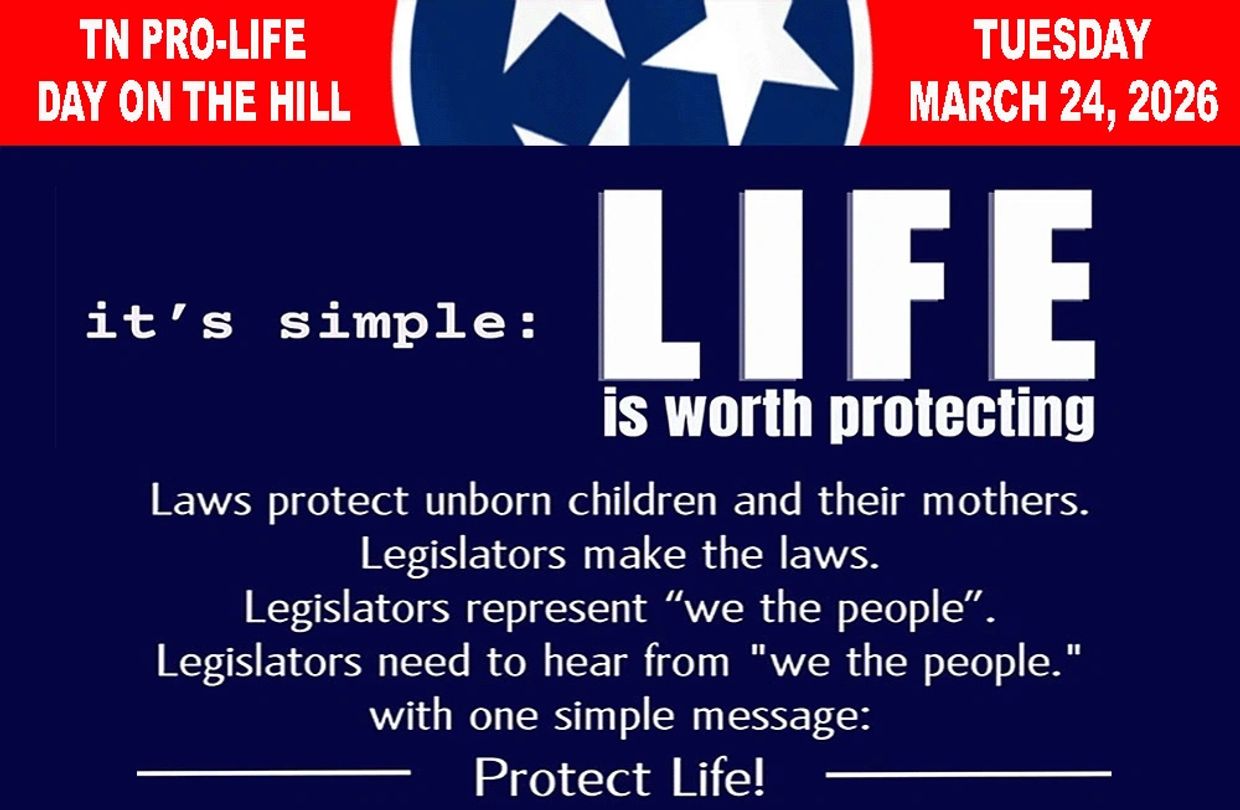 On March 24, 2026 hundreds of pro-life Tennesseans will gather together at the TN State Capitol in Nashville to continue building a culture of LIFE in our state and celebrate Tennessee's Pro-Life values. $40 per person by card, check or at the door. Please register by March 10, 2026. (Carpooling is available and encouraged). Contact us if you are interested in attending.